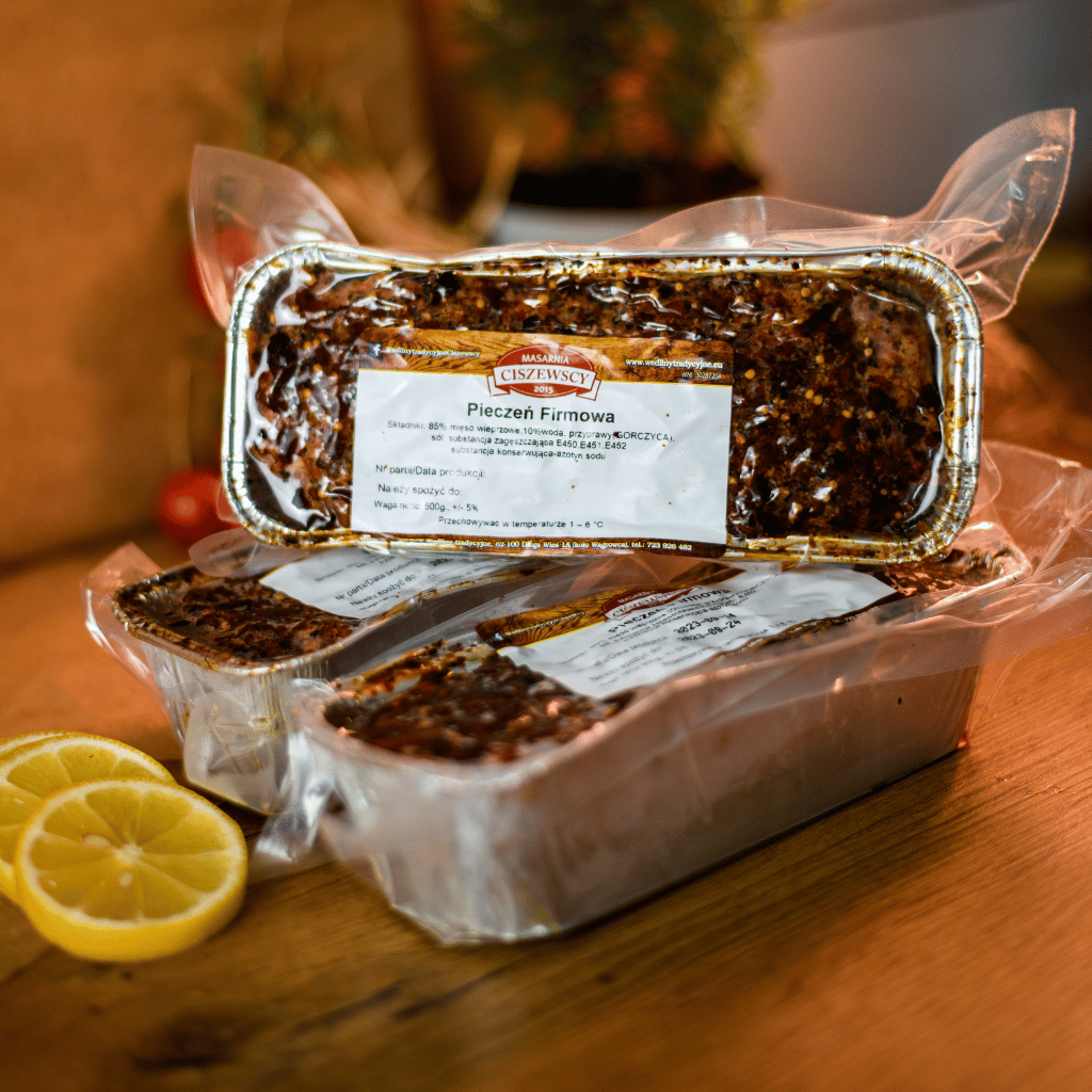 Pieczeń firmowa powstaje z wysokiej jakości mięsa wieprzowego (85%), które po odpowiednim doprawieniu i uformowaniu jest pieczone do uzyskania soczystej, zwartej struktury. Średnie rozdrobnienie nadaje jej delikatność, a jednocześnie zachowuje wyczuwalną mięsność.