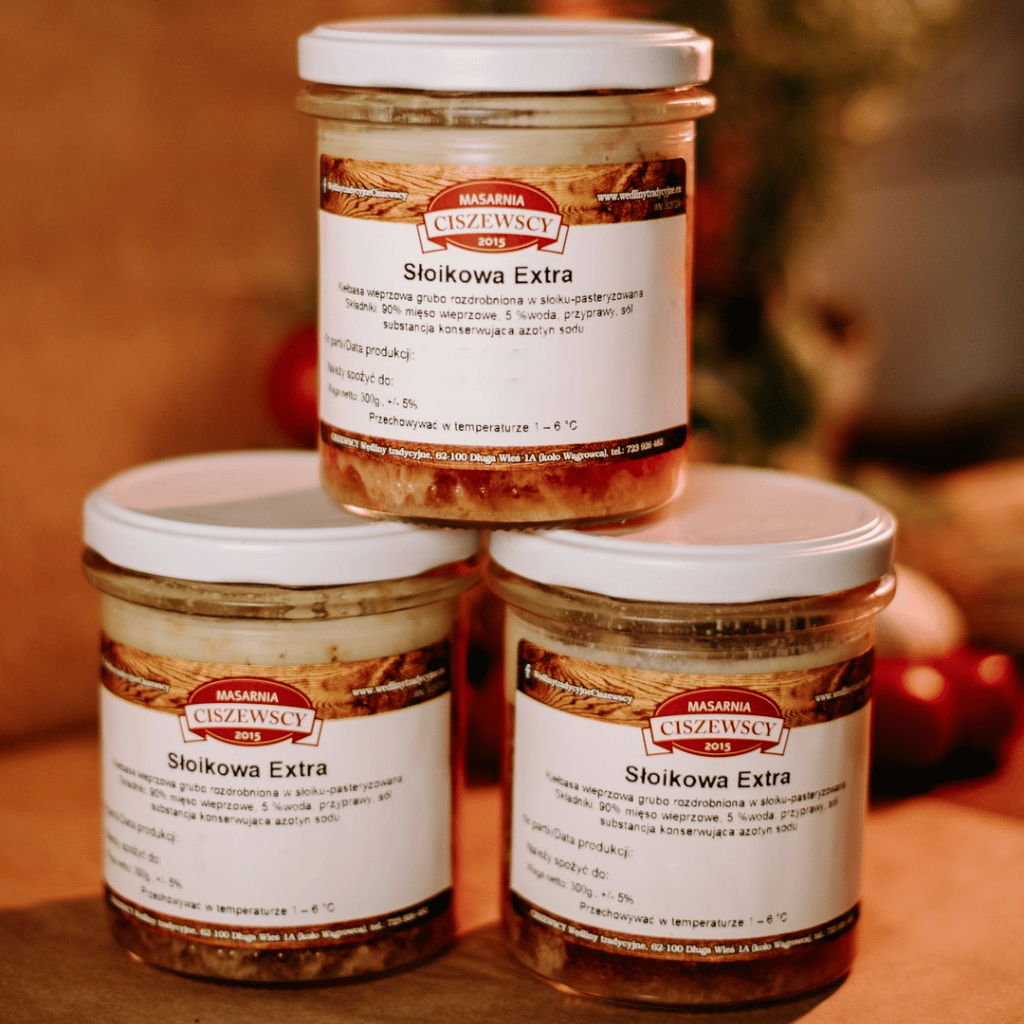 Słoikowa Extra to kiełbasa średnio rozdrobniona, pasteryzowana i zamknięta w wygodnym słoiku. Powstaje z wysokiej zawartości mięsa wieprzowego, co zapewnia jej pełny, mięsny smak oraz odpowiednią, zwartą strukturę.